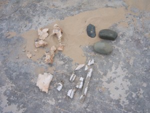 You cannot see the end of it, let alone walk it all. We dipped our toes and splashed along the shoreline until we came to the site of what John thought was evidence of pre-historic life. There were indeed early stone tools, hand axes and hammer stones, loads of fossilised bones (we thought human) literally appearing out of the rocks as well as giant land snails and shell midden. It was everywhere you looked.