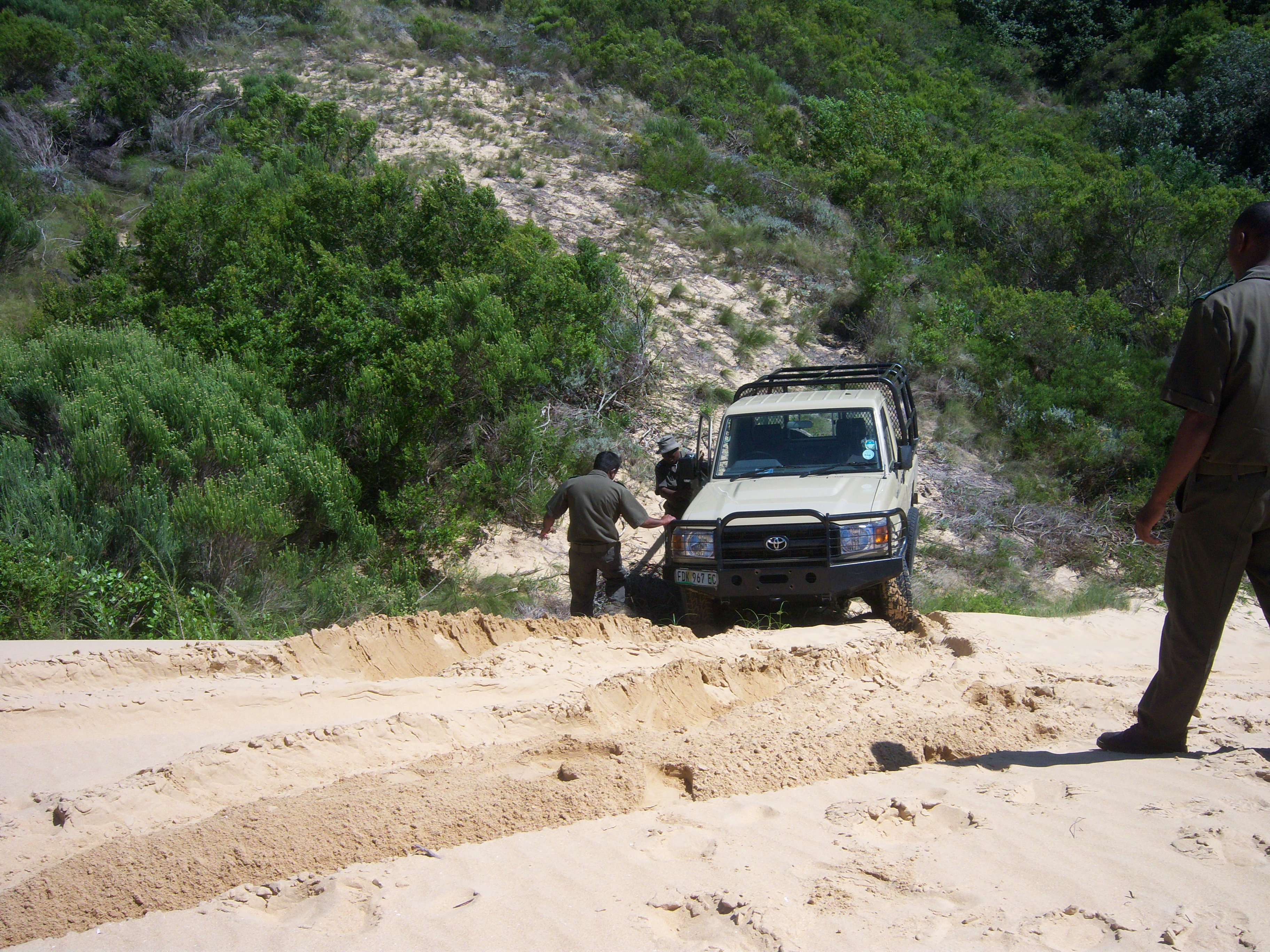 We drove through private bits of the park until we came to a steep sandy road which led us on to the dunes. The driver, who was very competent, gunned the Toyota but didn’t quite make it over the top. We all jumped out, he rolled back and, after getting stuck and being dug out, tried again without the load and  a good run up. This time he made it no bother. Everybody back on the bus for the ride of your life; through the dune fields then fast along the shore till we reached the right place, then into dune city once more. Exciting doesn’t cover it.